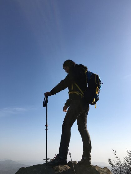 第二次的驻足是在这个耸立在山崖边的石头上。老司机,总是要玩点不一样的。还记得虫子大师曾经在海坨山上说过他站到了比海坨峰高出一米多的高度,我想我们站到石头上,举起手中的登山杖,也同样是那种“会当临绝顶,一览众山小”的感受吧。