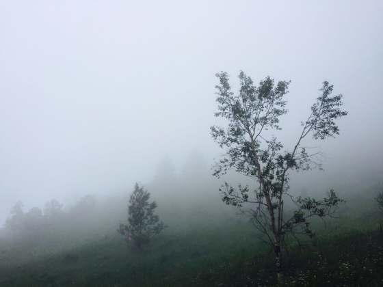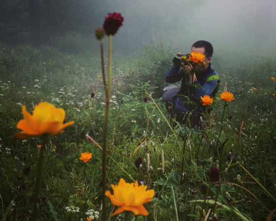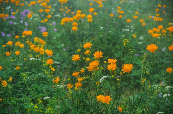 快到山顶时,雾气变得浓厚,高大的树木渐渐退去,绿绿的草甸、各色小花呈现眼前,最美的是金莲花。一直很不同意“中看不中用”这句话,看人家金莲花,盛开时金黄璀璨,晾干泡水喝也有众多功效,一点不负“塞外龙井”的称号。