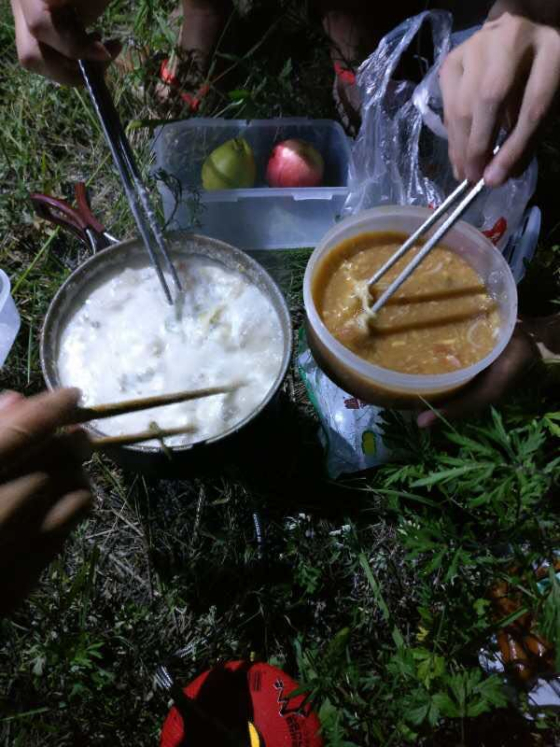 然后,就这样错过了农家院的晚餐,给自己加难度点着灯搭帐篷。营地的火锅也已经从麻辣锅底被吃成了西红柿鸡蛋面,还有就是继海坨山黑暗饺子之后的黑暗混沌,不过这次好歹是熟了。